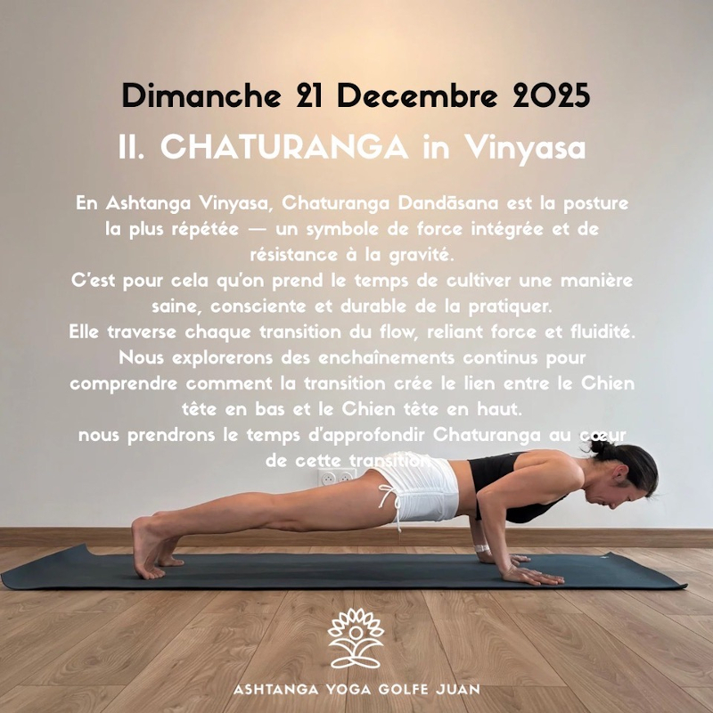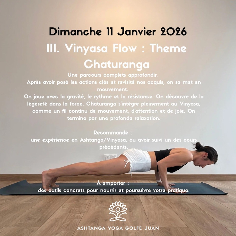 Stages & Cours Spéciaux Dim. 14 décembre, 16h30 - 18h15 Golfe Juan Détails & Inscription Dim. 14 décembre, 16h30 - 18h15 Golfe Juan Détails & Inscription Dim. 28 décembre, 16h30 - 18h Golfe Juan Détails & Inscription Jeu. 1er janvier 2026, 16h30 - 18h Golfe Juan Détails & Inscription Dim. 14 décembre, 16h30 - 18h15 Golfe Juan Détails & Inscription Lun. 23 février - Ven. 6 mars 2026 (mod. 1) Golfe Juan Détails & Inscription Mer. 13 - Dim. 17 mai 2026 La Clusaz Détails & Inscription Sam. 20 - Sam. 27 juin 2026 Salento, Italie Détails & Inscription Sam. 18 - Dim. 19 juillet 2026 Golfe Juan Détails & Inscription Lun. 20 - Ven. 31 juillet 2026 (mod. 1) Paris Détails & Inscription Lun. 26 - Ven. 31 juillet 2026 Golfe Juan Détails & Inscription Lun. 3 - Ven. 14 août 2026 (mod. 2) Paris Détails & Inscription Lun. 26/10 - Ven. 6/11 2026 (mod. 2) Golfe Juan Détails & Inscription Plus de dates et de détails seront ajoutés au fur et à mesure que les dates se confirment.Pour toutes nos activités à Paris ou dans le monde, c’est par ici >> - Programmes en ligne - Formation Professorale 200hÀ DISTANCE Stage d'Ashtanga pour débutants EN VIDÉO 4 mini-ateliers d'Équilibres sur les Bras EN VIDÉO 30 jours de défi Yoga : séances courtes EN VIDÉO Formation de Vinyasa Yoga EN VIDÉO Mini-stage Série Intermédiaire EN VIDÉO "Finding Balance in Mind & Body" mini-stage EN VIDÉO Anatomie pour le Yoga EN VIDÉO