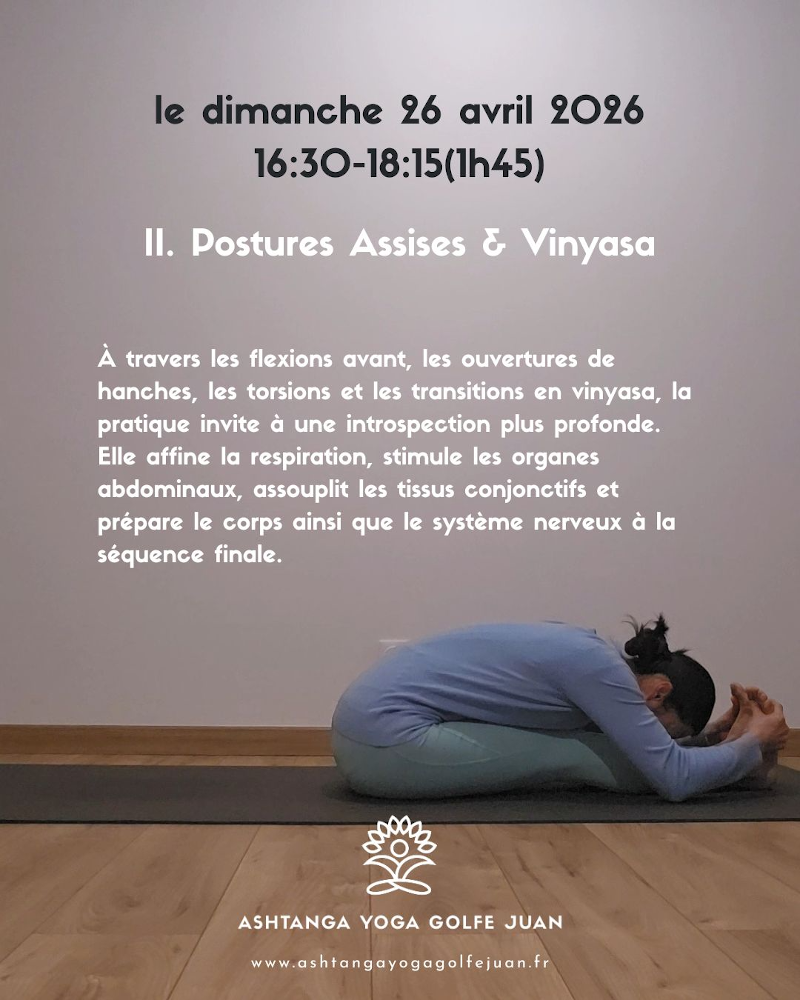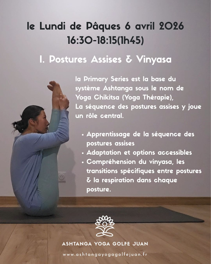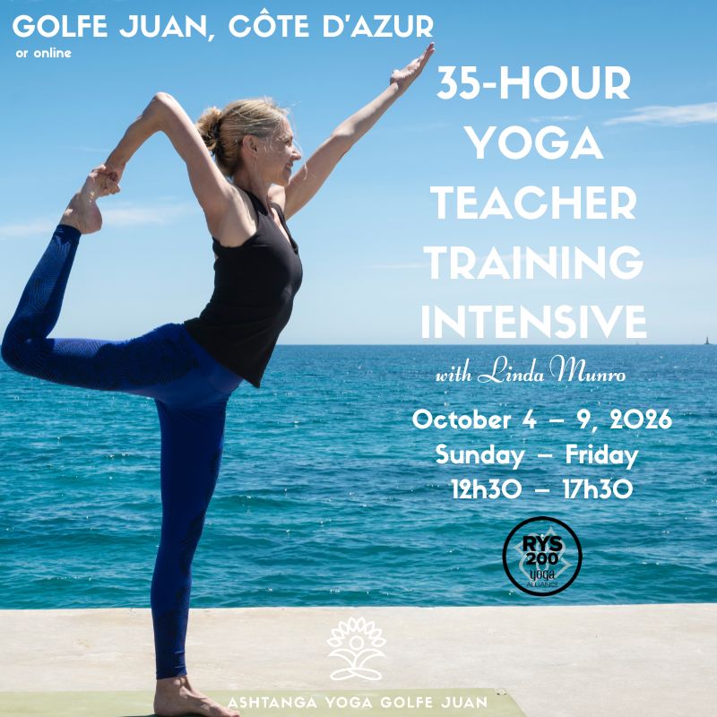Workshops & Special Classes Sun. 14 December, 4:30 - 6:15 pm Golfe Juan Details & Registration Sun. 21 December, 4:30 - 6:15 pm Golfe Juan Details & Registration Sun. 28 December, 4:30 - 6:00 pm Golfe Juan Details & Registration Thu. 1 January 2026, 4:30 - 6:00 pm Golfe Juan Details & Registration Sun. 14 January 2026, 4:30 - 6:15 pm Golfe Juan Details & Registration Mon. 23/02 - Fri. 6/03 2026 (mod. 1) Golfe Juan Details & Registration Wed. 13 - Sun. 17, 2026 La Clusaz, French Alps Details & Registration Sat. 20 - Sat. 27 June 2026 Salento, Italy Details & Registration Sat. 18 - Sun. 19 July 2026 Golfe Juan Details & Registration Mon. 20 - Fri. 31 July 2026 (mod. 1) Paris Details & Registration Mon. 26 - Fri. 31 July 2026 Golfe Juan Details & Registration Mon. 3 - Fri. 14 August 2026 (mod. 1) Paris Details & Registration Mon. 26/10 - Fri. 6/11 2026 (mod. 2) Golfe Juan Details & Registration More dates and details will be added as the dates get confirmed.See all our activities in Paris and worldwide over here >> - Online Programs - 200-hour Teacher Training ONLINE Anatomy for Yoga ONLINE Finding Balance in Mind & Body ONLINE 30-Day Challenge: short Yoga sessions ONLINE Vinyasa Yoga Teacher Training ONLINE Intermediate Series mini-workshop ONLINE Ashtanga Foundations Workshop ONLINE Arm Balance Challenge (mini-workshop)ONLINE